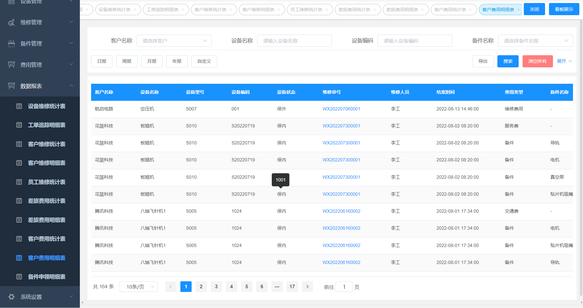 客户费用明细表,统计客户报修产生的明细费用(配件名称,数量,单价,服务费)
